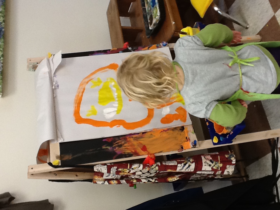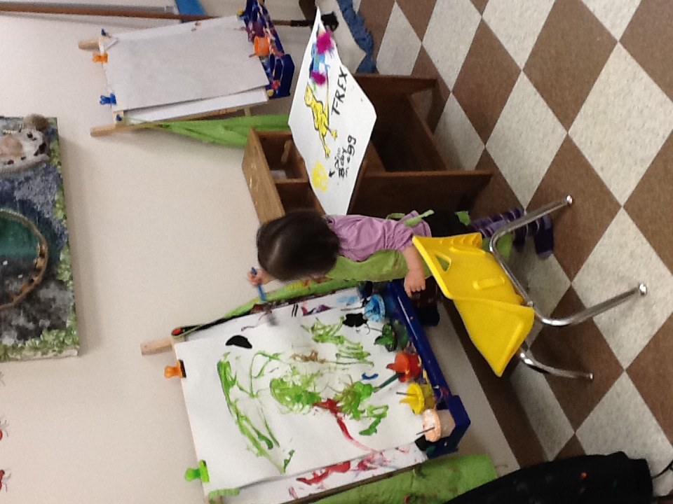 We took the easels off their stands and mounted them directly to the wall. It makes a bit of extra space on the floor, and lets the kids see what’s being painted on both sides.