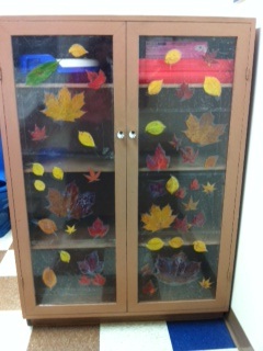 In less than 10 minutes, we found enough gorgeous red, yellow, brown leaves to scatter over the doors, with the bonus feature of also partially hiding the baby-sized toilet seat, diaper changing pad, and non-latex gloves from view. The end effect is all I hoped for. What do you think?