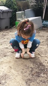 With the connection made between chicken and egg, all of the kids were keen to take care of an egg of their own and so, the game was afoot! Each found their own unique “egg” and made a little nest for themselves and promptly sat guarding their eggs. Every once and a while, a brave chicken would come by and scrutinize the kids’ brooding technique.