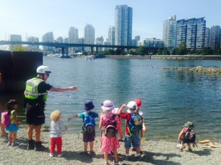 When we arrived at the water we started throwing some rocks into the water. Raffael calls that “Kaboom!” A police officer then arrived and came to talk to us and he showed us how to throw rocks so they would go along way. That was very nice of him so we all thanked him for that.