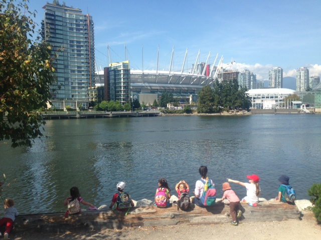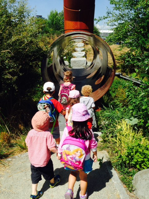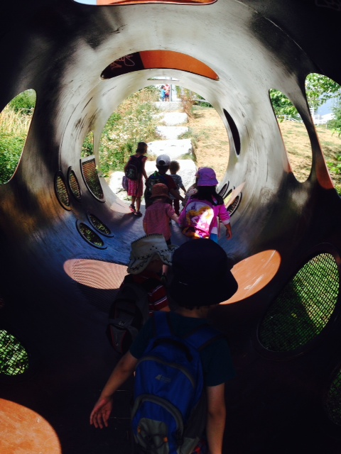 On August, Friday the 8th, we went for a field trip to False Creek. Our special mission was to find a small hidden island and some really big birds around there. The first thing that caught our attention as soon as our field trip started was an old tunnel that helped us cross over a small stream. It had holes all over it and even under our feet so we could see the water running beneath us. It was pretty cool!