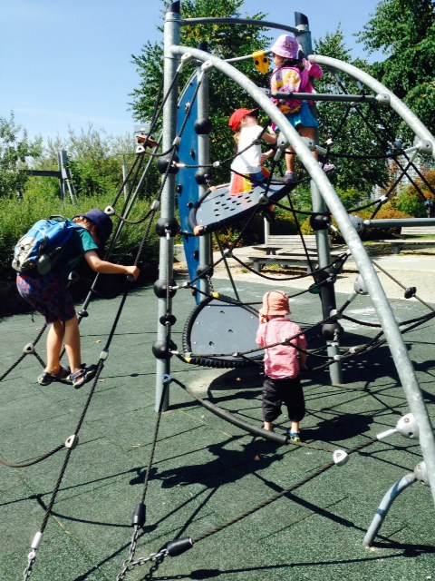 Heron and Asher spent lots of time playing with that water pipe. Every time they would run out of water Asher would climb up the hill and push the bottom again. Suddenly every one joined them. Right behind the water pipe we found a cool climbing playground. We were really excited!