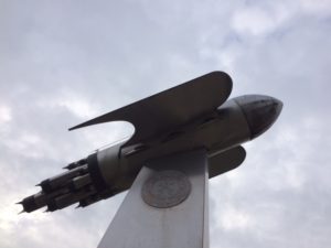 On the way back, we walked passed a rocket ship sculpture, and we took a picture of our reflections in puddles. We got to the bus stop just as it pulled up.