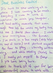 It’s fun to get letters from friends that you miss, and last week, I was lucky enough to get two! They are both from Buddings teachers missing in action, and their words make me so proud of the little daycare we all know and love.