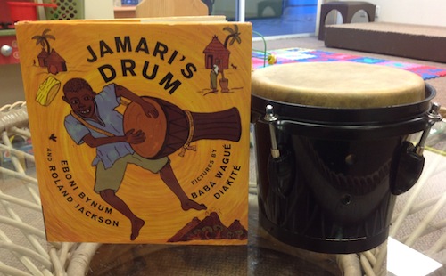 The second story we told “Jamari’s Drum” by Eboni Bynum, Roland Jackson and Baba Wague Kiakite, tells the story of the djembe drum and its vital role in keeping peace in the village and carrying on the village’s traditions. It is like the heartbeat of the village.