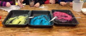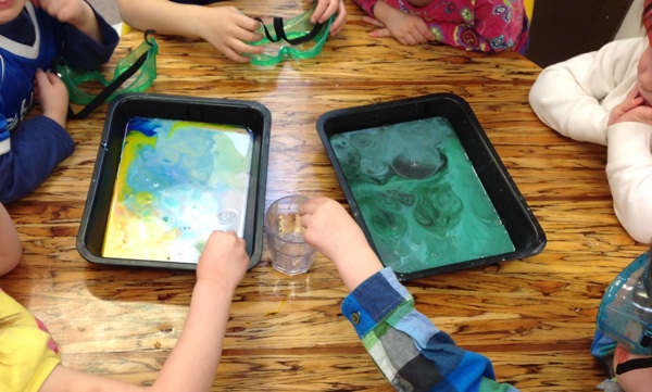 Last, but not least, we played with colour, mixing colours and making them dance. Who knew that cooking cornstarch, sugar and water would create a gel-like substance that you can use for colour mixing experiments? We took turns being colour alchemists, mixing different primary colours to see what new colours we could create. Next we made colours dance, by adding food colouring to milk, and then taking turns to add dish soap, drop by drop. The colours started to swirl and mix before our eyes, as if by magic and the kids delighted in this colourful display!